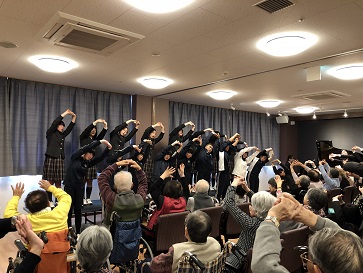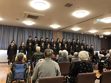 はじめは緊張や不安で体が硬くなってしまいましたが、自然体で私たちを迎え入れてくださったお年寄りの方々の姿を見て、緊張がほぐれ、歌や体操を通して、お互いに笑顔になることができました。また、「ふるさと」を一緒に歌ったときには、涙を流す方もいらっしゃり、私たちも胸が熱くなりました。