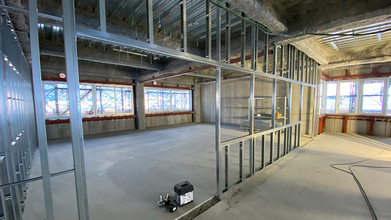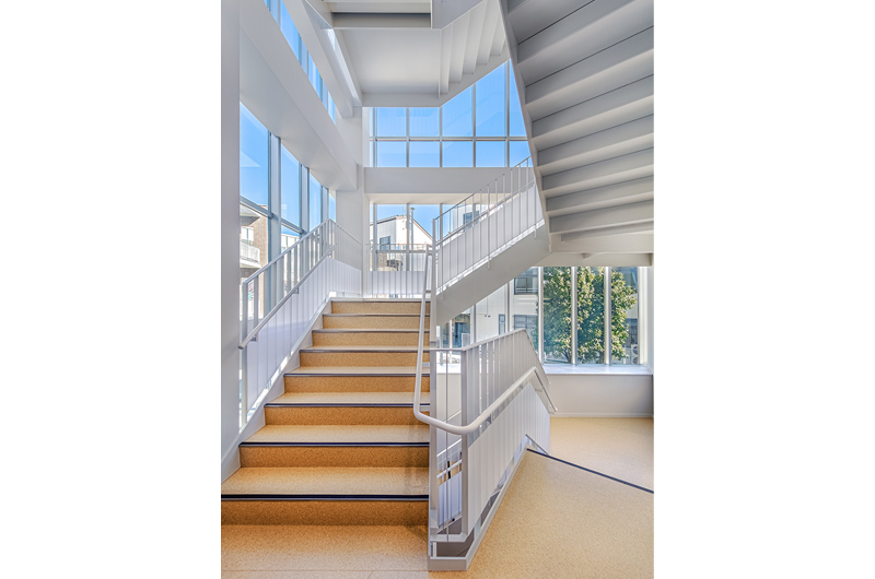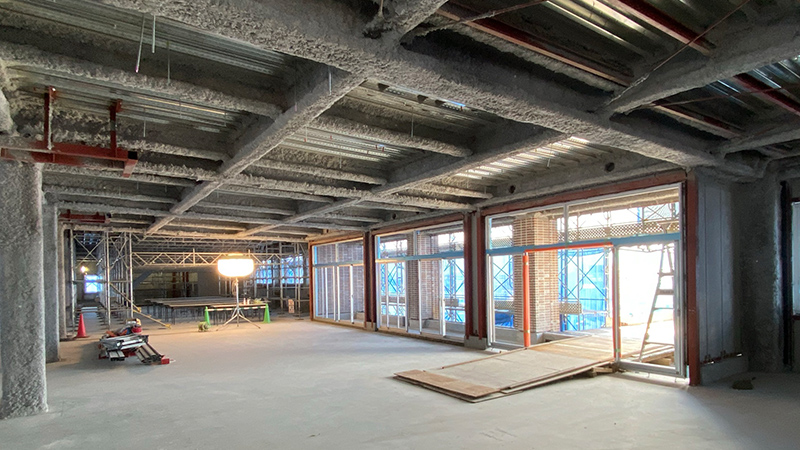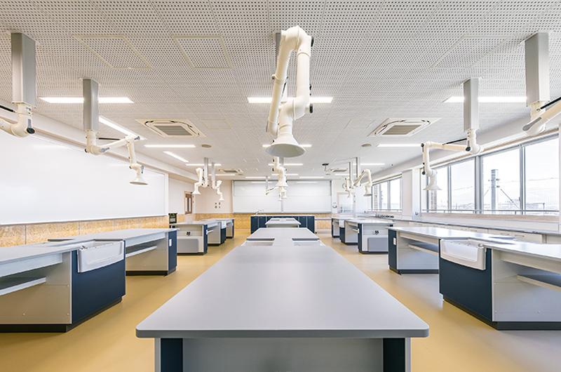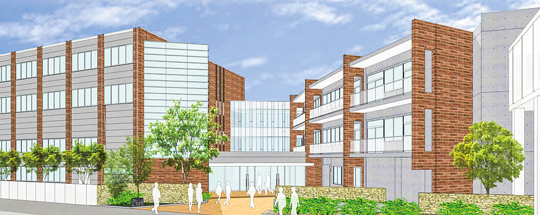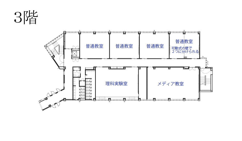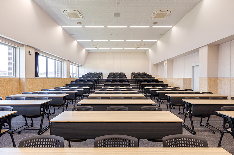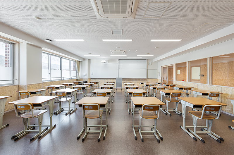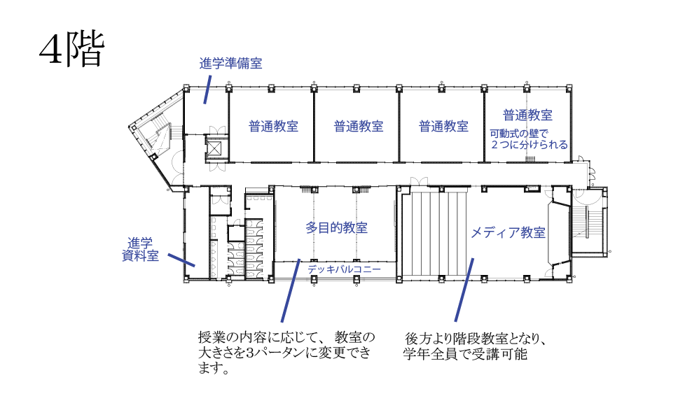 1・2階に新講堂、3・4階に普通教室と特別教室、また生徒の自主学習・自主活動を活発に行える自由教室を配置しています。パーテーションを活用した可動式教室も設置し、これまで以上に、さまざまな授業形態に対応可能となります。また、新校舎には後期課程生のホームルーム教室の一部とともに、進学準備室・進学資料室を移設します。気軽な進路相談などを通して、生徒一人ひとりの進路実現に向けて、適切かつ的確な支援が加速します。