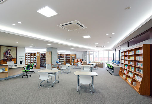 3階建てのシンボル的なリングタワーを備えた建物は常念棟と呼ばれ、1階にはアトリウムや図書館、2階からは普通教室、理科講義室、理科実験室、3階にはメディア教室、CALL教室、多目的教室などが配置されます。1階から3階まで見渡せる吹き抜けのアトリウムは自然光が降り注ぎ明るく心地よい空間です。
