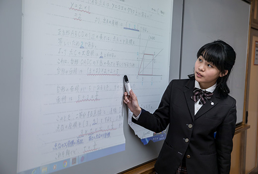 開校当時から電子黒板を導入し、パソコン、インターネット、AV機器などを活用したICT教育を行い、情報活用能力・情報分析能力・コミュニケーション能力・プレゼンテーション能力の育成を図ります。本校では個人のリテラシーにあわせて、BYOD(自己所有機器)の活用を行っています。