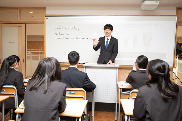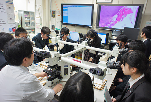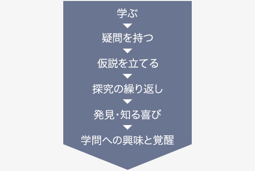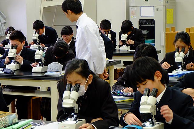 科学的思考力・語学力の強化に向けて、大学・研究機関との連携などにより、先進的教育を推進するとともに、学ぶ喜び、知る喜び、解決する喜び、発見する喜びに満ちた授業を展開。論理的思考力を養いながら、生徒の意欲をもとにした真の理解を促す授業をすすめています。