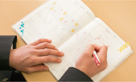 PDCAを見える化するために手帳を効果的に活用して、自己管理能力や書く力、キャリアプランニング能力を育みます。本校では、入学時から自分で学習計画を立てることを徹底することで、早い段階でのPDCAサイクルの定着を図ります。