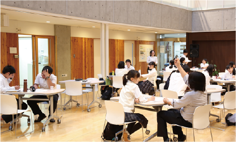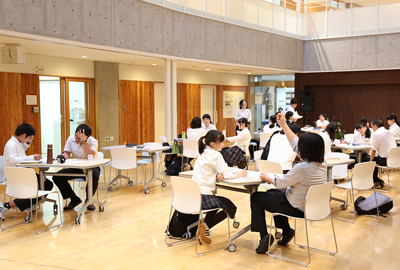 「学ぶ姿」は周囲に良い影響を与えると考え、生徒同士の学び合いの場を校舎の中心に据えています。学びの相互作用を促す環境も整えてます。その一例として、平日の放課後に学習室も利用できます。