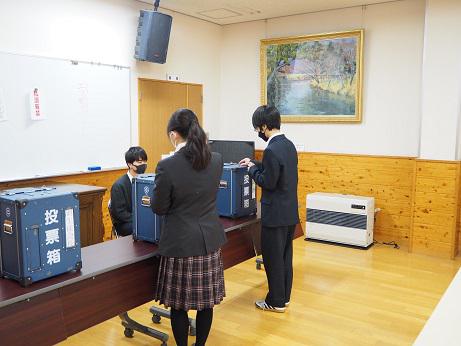 翌日に行われた投票では、生徒会長、副生徒会長、生徒会会計の三役について、有権者である全校生徒が票を入れました。松本市選挙管理員会からお借りした、実際の選挙でも使用される投票箱に、生徒たちは責任をもって投票をしていきました。