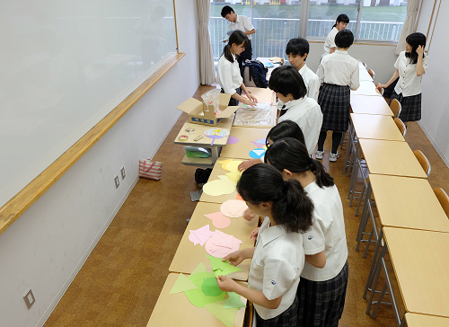 2016.07.26 生徒の活動 アトリウム装飾準備 ~Shuho Festival 2016#3~ Tweet 秀峰祭に向けて、実行委員を中心とした有志が、昨年に引き続き本館アトリウムの装飾の準備を進めています。1~5年生まで、様々な感性を持った生徒が、館内を彩り豊かになるようなアイディアを出しあって、放課後の小教室で作業を進めています。 初めて秀峰祭に参加する1年生は、後期課程生に作業の仕方を教わりながら、装飾作りに熱心に取り組んでいました。今年のテーマは「乱舞」。生徒たちはこのテーマを装飾でどのように表現するのでしょうか。 前の記事 次の記事