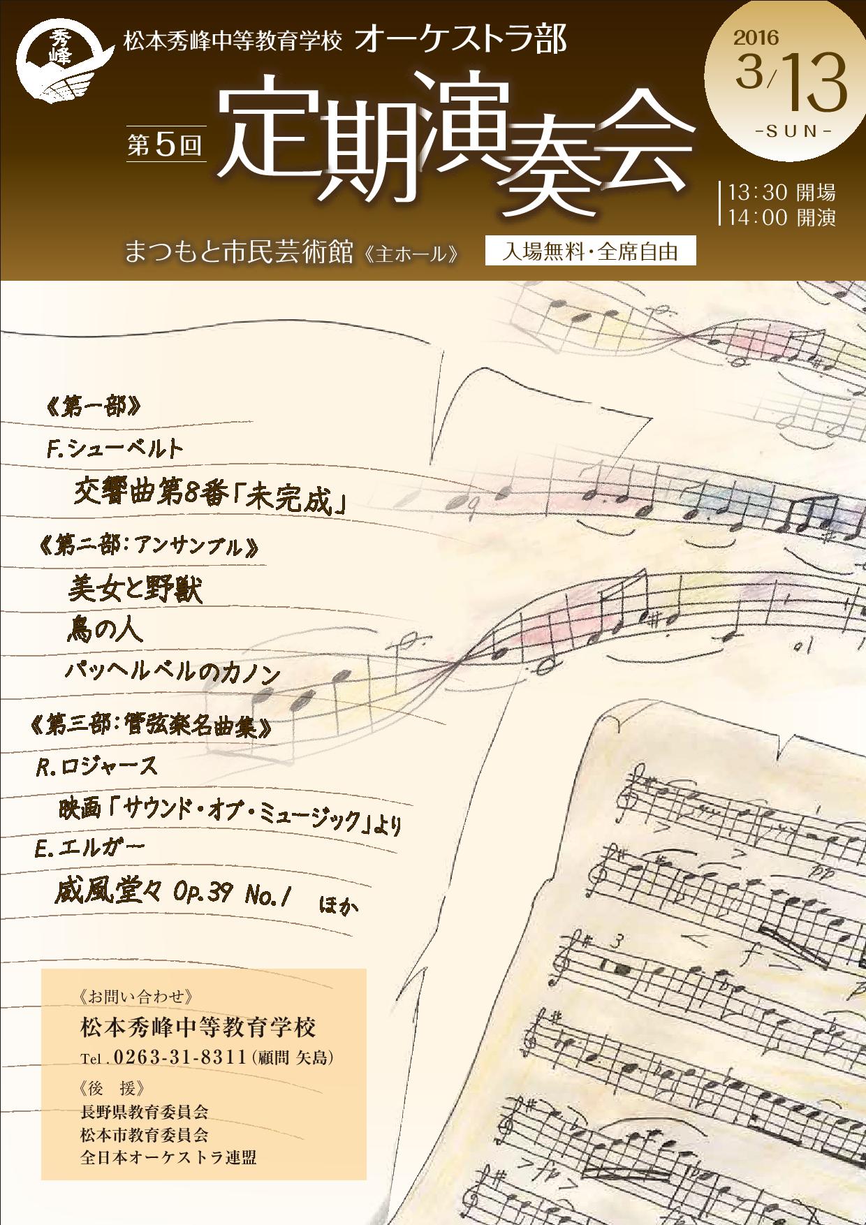 2016.03.05 生徒の活動 オーケストラ定期演奏会間近! Tweet オーケストラ部は,第5回定期演奏会を3月13日(日)にひかえ,練習も追い込みに入りました。 会場となるまつもと市民芸術館のステージを想定して,講堂で練習を行いました。全体の流れや動きを確認しながら広い場所で練習できたことで,本番をイメージすることができました。 本番まで2週間を切りましたが,残りの時間で一人一人できる限りのことをやり,当日を迎えたいところです。 部員一同,多くの皆様のご来場を心よりお待ちしております。 前の記事 次の記事