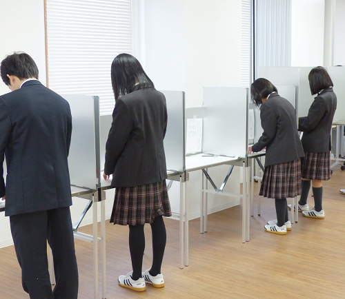 インフルエンザなどで欠席者が若干目立ちましたが、生徒たちは早朝から積極的に投票所に足を運び、生徒会のこれからを委ねたい立候補者への投票を行いました。