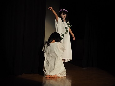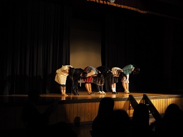 作品は客席から笑いが起こる場面も多くありながら、涙を誘う場面もあり、皆さん見入っていたようです。また、今回は会場である講堂のステージだけでなく、フロアやギャラリーも舞台として演出を施す工夫がありました。