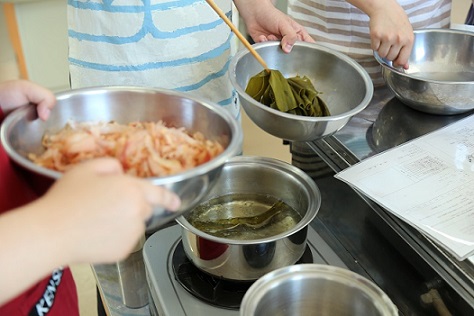 午前11時をまわり、お昼も近づいたころ、なにやら家庭科室から花かつおのよい香りが漂ってまいりました。のぞいてみると4学年の調理実習のようです。
