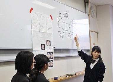 部員たちは自らの研究成果を伝えるために、スライドやポスター、図などを用いて分かりやすく発表しました。発表後、1年生は活発に質疑を行い、科学部の上級生と直接話すことで部の雰囲気を感じとれた様子でした。