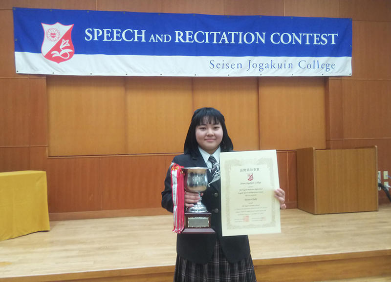11月11日(土)に「第18回長野県高校生英語スピーチ・レシテーションコンテスト」が開催されました。本校5学年の生徒が、レシテーション部門において、表現力や英語の発音技術が高く評価され、見事、第1位に入賞し『長野県知事賞』を受賞しました。
