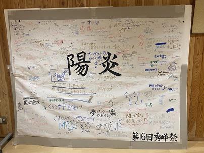 寄せ書きには、今年のテーマである「陽炎」の文字を中央に据え、すでに多くの生徒が秀峰祭に向けての意気込みを書き込んでくれています。
