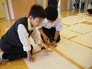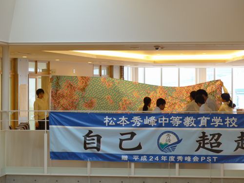 モザイク画は、生徒たちが秀峰祭のテーマ「乱舞」に沿った絵を選び、一人ひとりが折り紙を切り分け模造紙に貼り付け、計84ピースを組み合わせて完成させるというものです。1ピースを作っただけでは、完成形がなかなか想像できませんでしたが、ピースが合わさるにつれ、全体像が浮かび上がってきました。そして9月21日の準備日、見事設置ができました。