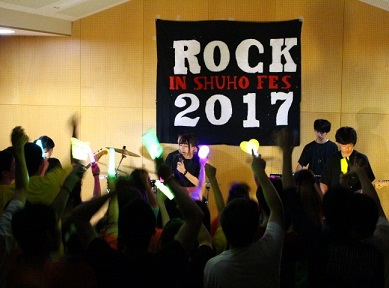 あすなろ館3階音楽室では軽音楽同好会によるバンド演奏が行われています。洋楽からJーPOPまで幅広いジャンルの音楽を披露してくれるそうです。