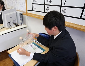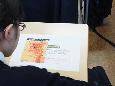 次に、松本市の地盤を調査・研究して作成した「ゆれやすさマップ」をもとに、松本秀峰周辺の地盤の性質を学びました。特に、松本城から南松本駅方向に揺れやすい地域が広がっているという話には多くの生徒が関心を持ったようです。