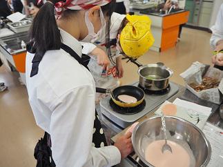 出汁をとっている間に、桜餅を作ります。関東風の桜餅は、小麦粉で練った皮をフライパンで焼き、餡を包んで形を整え、最後に葉を巻きます。生徒たちは焦がさないように皮を焼き、楽しそうに桜餅を作っていました。