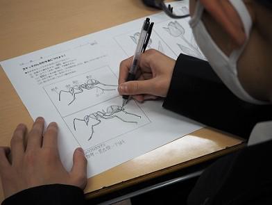 最初はお手本となるスケッチをそっくりに描く練習をしながら、理科における正しいスケッチの仕方を学びます。今回用意したのは、アリとチューリップです。輪郭を丁寧な一本線で、陰影や色の濃淡は点で描くのがポイントです。生徒たちははじめに輪郭を鉛筆で下書きし、最終的にペンで丁寧に清書しました。スケッチを通して、これまで注目していなかったところにも目が届き、新たな発見をすることができたようです。