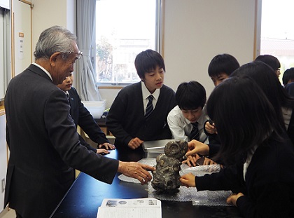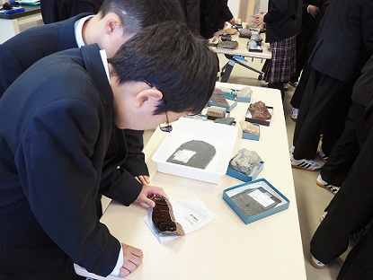 まずはそれらの観察です。実際に触れてその重みや手触りを感じながら、生徒たちはそれぞれお気に入りの化石を探していました。気になったものがあると「これは何の化石ですか。」と活発に校長先生に質問をしていました。生徒たちにいちばん人気だったのは、きれいに磨かれたアンモナイトの化石でした。