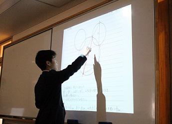 そして、完成した問題・解答案を元に、それぞれのチームがプレゼンテーションを行いました。各チームが電子黒板を用いて説明し、聞き手となる生徒たちは、説明の分かりやすさや話し方、アイコンタクトなどを評価シートで採点します。すべてのチームが問題のポイントや工夫したところを発表しました。