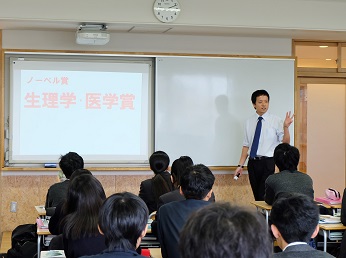 昨年に引き続き、今年も3学年ではノーベル賞特別授業が行われました。今年は日本の本庶佑氏がノーベル生理学・医学賞を獲得したことで話題になったため、生徒の関心もより高まっていました。