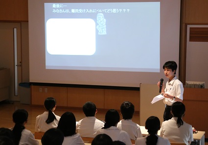 この日登壇したのは、事前に行われた予選で優秀なプレゼンテーションを披露した生徒たちです。簡潔で分かりやすいスライド作りや色を用いた視線誘導、身振り手振りなどといった、「伝えるための工夫」を学年全体で共有することが出来ました。物怖じすることなく懸命に発表を行っているその姿に、生徒一人ひとりの確かな成長が表れていました。