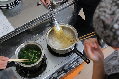 限られた時間の中で、生徒たちは出来上がりの順番を予め想定して調理をしました。ワンプレートディッシュのメインは鶏肉とトマトのパスタとなります。時間のかかるソース作りを先に行い、パスタを茹でたり、スープを作ったりと同時進行で作業を進めました。連携をうまくとりながら効率よく調理することで、どの班も時間通りに料理を完成させることが出来ました。