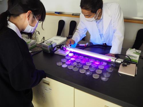 6学年の生物の授業の一環として、遺伝子組換え実験を行いました。今回の実験は、「遺伝子組換え生物等の使用等の規制による生物の多様性の確保に関する法律」(カルタヘナ法)に基づき、事前に研修課程を修了した教員の指導の下で安全に行いました。