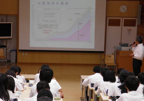 松本税務署から職員の方をお招きし、日頃の子どもたちにとって縁遠い「税」について、アニメーションなどを交えながらわかりやすく説明していただきました。