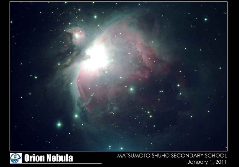 2011.01.12 授業実践 天体望遠鏡、いよいよ始動! Tweet 本校の天体望遠鏡と天体用冷却CCDカメラで、オリオン座にある2つの星雲の撮影を行いました。 今回は、本校理科教諭による撮影です。 一見、きれいな天体画像に見えますが、画像処理、撮影方法、極軸合わせなど、 まだまだ甘い点も多く見られます。 これからも、興味のある生徒と共に技術を磨き、よい写真を撮影・公開していきたいと思います。 ○設備 鏡 筒 :タカハシ ε180ED 赤道儀 :タカハシ EM-200 冷却CCD:BITRAN BJ-41L ○今回撮影した星雲 オリオン大星雲 馬頭星雲 前の記事 次の記事
