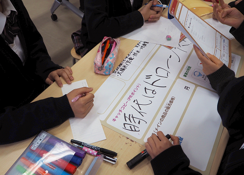 まずは各自で魅力ある事業を企画し、その後、数人が集って班になり、各自の考えをまとめて1つの会社を企画しました。そして、自分たちの事業企画を投資家(他の班の生徒たち)に訴え(プレゼンし)、資金を調達しました。(投資家は1人100万円×2を魅力的なプレゼンをした事業に投資することができます)