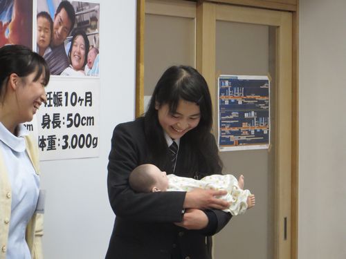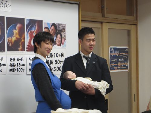 講座ではとても作りこまれた資料や、赤ちゃんを模した人形、妊婦さんのボディーバランスを体感できる妊婦ジャケットなど、生徒たちの興味をひくような教材が多数用意されており、生徒達は熱心に聞き入っていました。