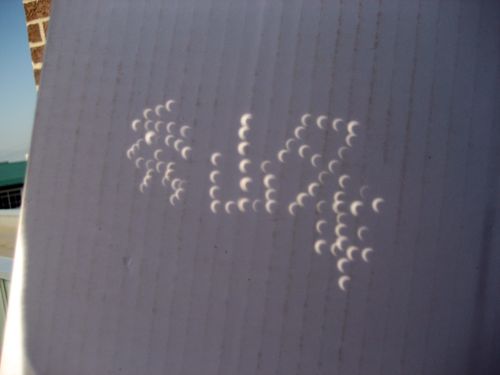 朝7:00ころに登校した生徒は、個々に用意した日食グラスで観察したり、ピンホールを通して投影される太陽の形を見て、現象を楽しんでいました。