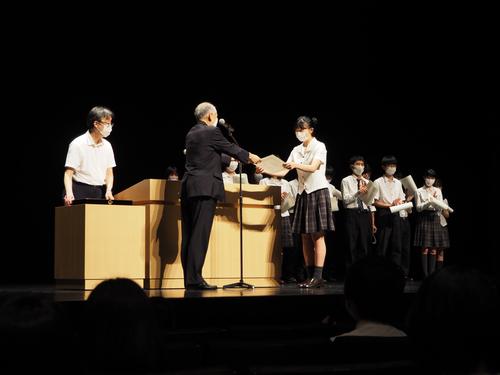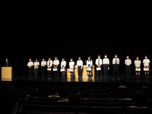 7月29日(水)、まつもと市民芸術館にて学校長表彰が行われました。これは、本来昨年度3月に執り行うはずだった式典で、その年度に大きな活躍や躍進を遂げた生徒を称えるものです。まつもと市民芸術館で行われるのは初であり、会場が厳かな雰囲気に包まれる中、旧学年主任から推薦理由が述べられました。そして、受賞者の名前が発表され、全校生徒から温かい拍手を贈られながら、一人ずつ檀上に上がっていきました。表彰された生徒たち一人ひとりに感想を述べてもらい、感動的な場となりました。