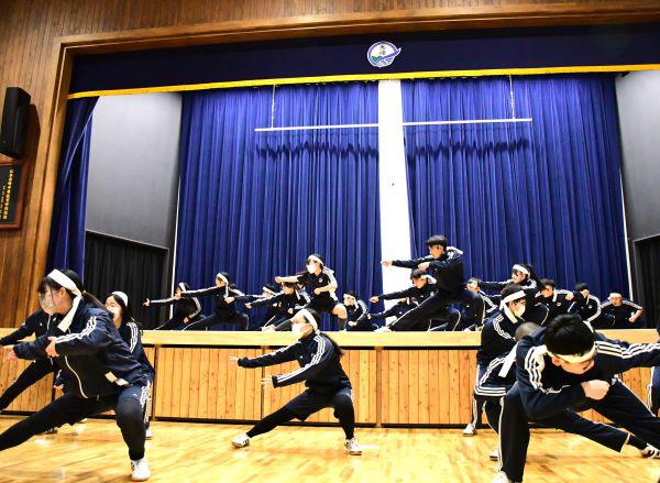 お二人の演舞の後に続いて披露された3学年のよさこいソーラン節演舞では、講堂の両サイドも使い、学年全体の団結力の強さを体現するような演舞が披露されました。体育の時間や放課後の時間を利用して、幾度となく重ねてきた練習の成果が存分に発揮されたようです。場の空気を一気に引き込む熱のこもった演舞が終わると、会場から大きな拍手が送られました。