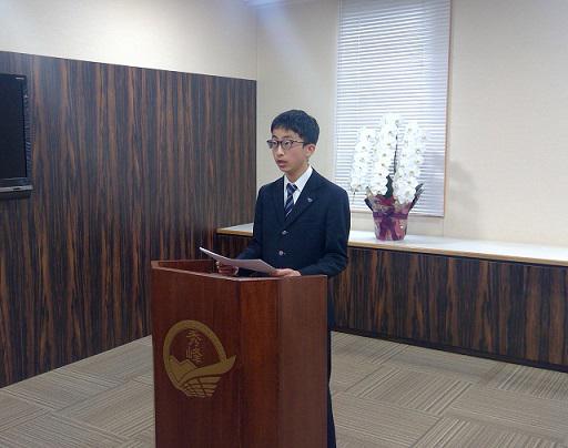 続いて、2年生の代表生徒からは、今年度の総括と次年度の抱負が述べられました。「1年の初めに、課外活動へ参加するという目標を掲げ、実際に複数の同好会に所属した。挑戦する勇気を得たことに加え、仲間と力を合わせる楽しさを知った。また、学習面では、1年を通して自身の習慣を確立することができた」と振り返りました。さらに、「来年度は、新たなことを学ぼうとする意欲を持って課外活動に取り組むこと、毎日の学習計画を立てて勉強に励むことを目標に、前期課程最高学年の1年を充実させる」という決意が語られました。