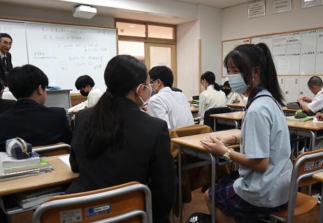 その後、台湾の学生たちは3学年の教室で一緒に昼食を食べ、バディに付き添われて英語の授業に参加しました。本校の試験1週間前ということもあり、なかなか緊張感もあったかもしれませんが、英語で自己紹介をしたり、「もし台湾/日本に住んでいたら」という仮定法を使った質問の答えに、お互いのおすすめを教え合うなどして授業が進みました。