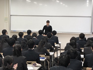 その後、信州大学に通う本校の卒業生から、進路選択や日々の学習法など、当時の学校生活を具体的に話していただく講演がありました。生徒たちは先輩の言葉に耳を傾け、積極的にメモを取っていました。