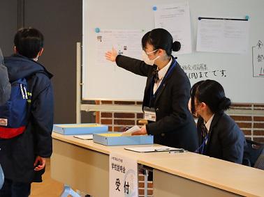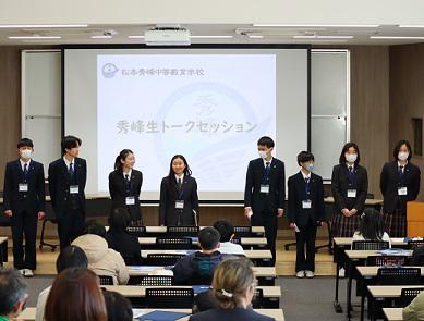 続いて行われた秀峰生トークセッションは、「学習~前期課程生と後期課程生~」と「探究~宿泊研修・海外研修から~」という2つのテーマで行い、学習の仕方や定期テストの取り組み方、学校行事を通した探究活動など、秀峰生の「学び」について、秀峰生自身の言葉でお伝えいたしました。