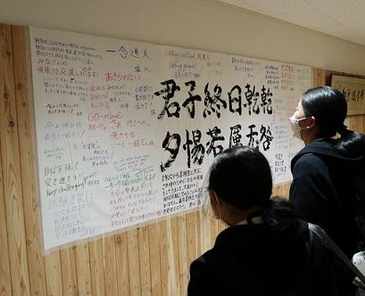 「君子終日乾乾 夕惕若 厲无咎(君子たるもの終日、務め励み、夕べに反省し、恐れ慎むことを忘れてはいけない。そうすれば、危ないながらも咎は免れる)」という言葉を中央に配し、教職員一人ひとりが心を込めて寄せ書きをしました。
