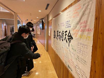 冬期休業明けから毎日行われている「共通テスト対策実戦演習」を終えて集まってきた生徒たちは、心に刻むように一つひとつのメッセージを見つめていました。受験直前ということもあり、生徒の表情からは、各々の希望進路実現への確かな自信がうかがえました。