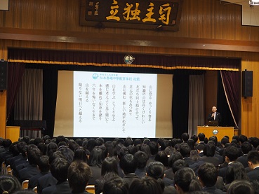 集会では、始めに小坂校長から、自ら学び個性を伸ばしていくことの大切さについてのお話がありました。生徒と教員が共に学び、高め合う姿勢を持ち続けようと呼びかけられました。