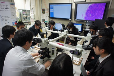 生徒たちは実際使われている「ディスカッション顕微鏡」を用いて、一つの試料を同時に複数で観察したり、細菌を培養しながら薬の効きを確かめている培地を見たりと、普段の学校生活では決して体験することのできない貴重な体験をすることができました。