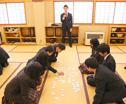 2017.01.10 学校行事 日本の伝統文化に親しむ、恒例の百人一首大会 Tweet 1月7日(土)、1学年から3学年で「百人一首大会」を行いました。 これは国語の授業の一環で、百人一首を通して日本の伝統文化に親しむと共に、古典学習への興味を喚起することを目的としています。 生徒たちは冬季休業中に、100首を暗誦できるように努め、大会に臨みました。大会は学年ごとにクラスマッチ形式で行われ、彼らは自分の好きな歌や覚えてきた歌を取ろうと懸命に取り組んでいました。 日頃聞きなれない古い言葉やそこで詠まれた心や情景に触れたことは、今後の古典学習にも活かされることでしょう。 前の記事 次の記事