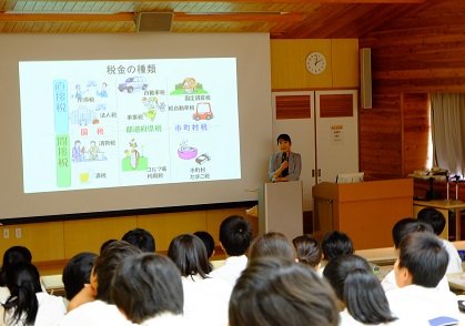 今回は、私たちの生活に関わっている多種多様な税について、アニメーションやスライドを交えながら分かりやすく説明していただきました。生徒たちは手帳を片手に、初めて知ったことや重要だと感じた言葉をメモにとっていました。