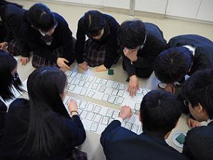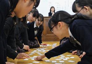 百人一首は12月から授業で扱われており、生徒たちは冬期休業中に100首を暗誦できるように努め、大会に臨みました。大会は学年ごとにクラスマッチ形式で行われ、札の読み手は生徒が担当しました。札が読まれると、生徒たちは自分の得意札を取ろうと懸命に手を伸ばし、白熱した戦いとなりました。