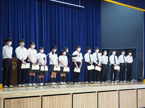 6月16日(木)、LHRの時間に表彰が行われました。生徒たちは日々、学習や部活動、生徒会活動、課外活動などに一生懸命取り組んでいます。学校長表彰は、その中でも多方面で顕著な活躍をした生徒を表彰するものです。今回は2021年度度の学校長表彰として、2~6学年の各学年から3名ずつ、合計15名の生徒が選ばれました。
