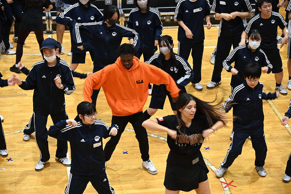 ワークショップは、1グループ7~8名にハートグローバルのネイティブキャストが1名つき、心のこもった熱い指導を受けました。身体全体を使って表現する歌や、一流のダンスステップを教えていただき、一歩前に出られなかった生徒には優しく励ましをもらいました。