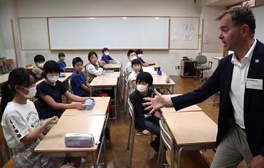 OCの教室では授業開始前からネイティブ教員とじゃんけんをしてリラックスするシーンもありました。授業では児童の皆さんも積極的に発言し、どの教室も盛り上がりを見せていました。また、アシスタントを務めた秀峰生とも打ち解け、仲良く過ごしている様子も印象的でした。