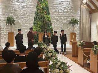 その後、宿泊内の「チャペル」にて、チームごとの探究活動報告会を開催。こちらでも、一足先に新郎新婦の場所に立ち、「学び」に対する永遠の愛を2日目の報告と共に誓ったようです...。