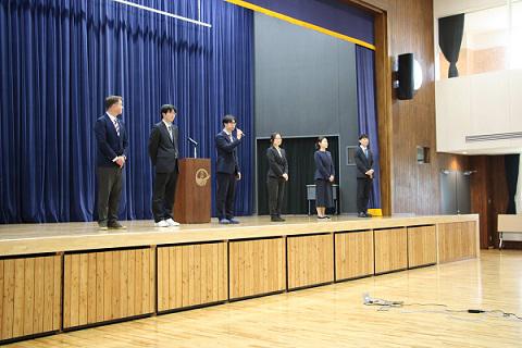 続いて、本年度の学年配置ごとに教職員の自己紹介。事務職員を含め全教職員からご挨拶申し上げました。